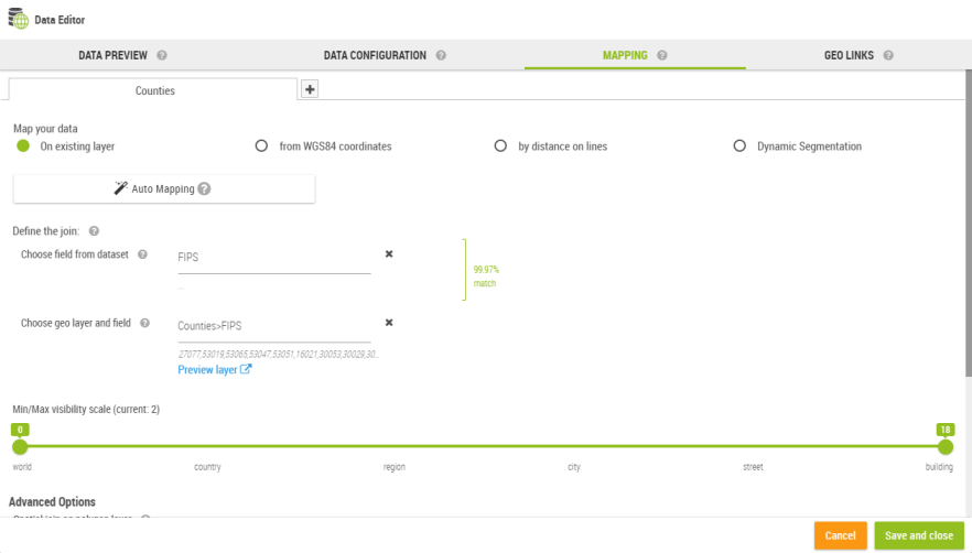 Example: Let’s say we our data is represented at two levels: a layer US States and a layer US Counties. US States can be visible from world to country and US Counties from country to building. This way, when the map is unzoomed to the whole country, the states are visible and zooming on a state will show the counties. |