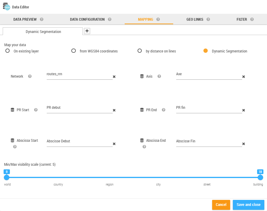 The dynamic segmentation is based on a linear data network (networks of roads, railroads, pipes, etc.) and allows the representation of segments placed between two reference points.