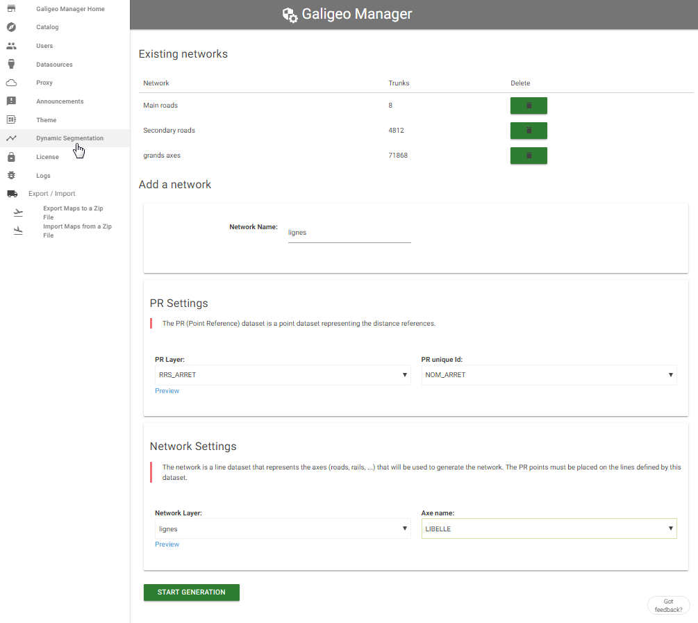 The management of available networks is done from the Galigeo Manager > Dynamic Segmentation.