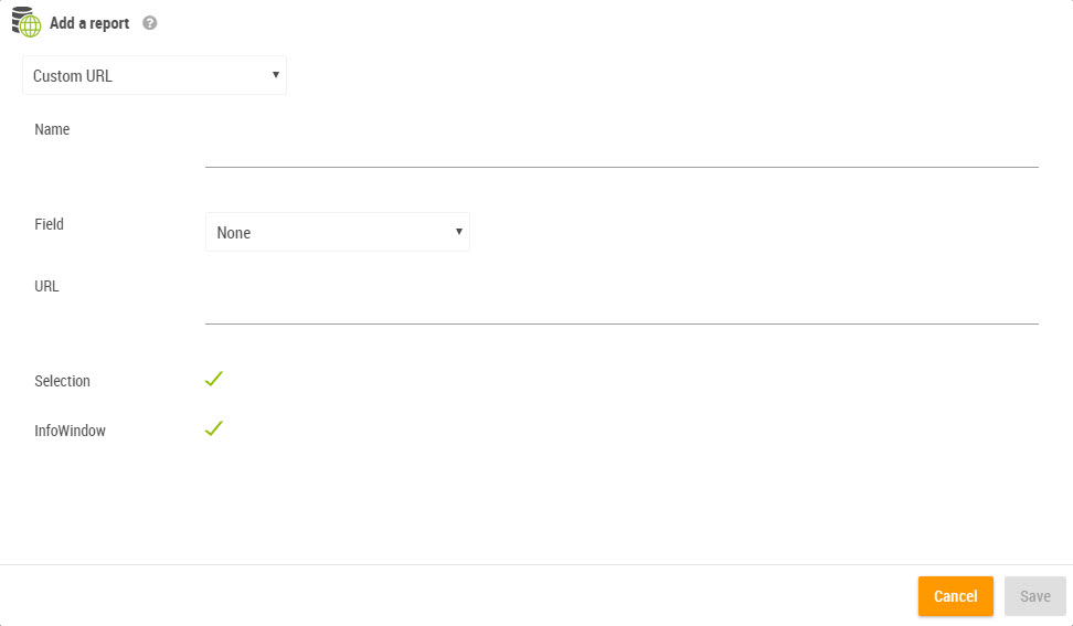 URL: a URL that can contain the element [values]. At runtime, [values] is replaced by the value of the “field” for the selected object. If several objects are selected, then [values] becomes a list of values separated by comma.