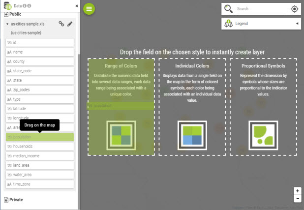 Each dataset can be unfolded and thematic layers can be added to the map using a single drag and drop: