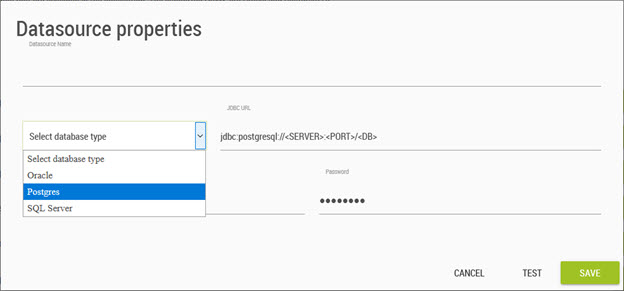 The JDBC URL allows referencing the placing of the database (type, server, port, scheme). Only the the Oracle and Postgres databases are supported.