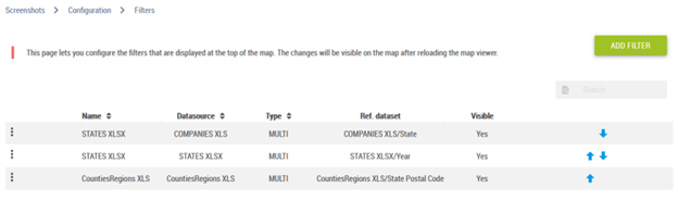 The filter settings page is used to configure the dynamic filters displayed on top of the map.