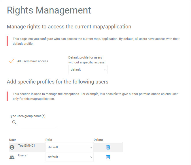 Here it is possible to add users or user groups, and define their role on the map. Here furthermore, when the “Default” role is selected, the user accesses the map with the role by default.