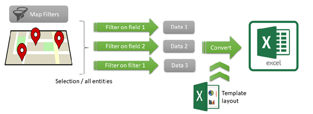 Galigeo can produce some reports based on the Excel or HTML format. A report is composed of a list of datasets from the map. By default each dataset will appear on a separate sheet and it is possible to specify a custom layout based on a template.