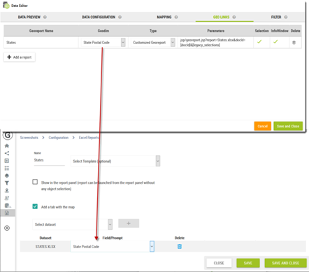 The reports are associated to a dataset through its url using a geolink (see section 6.6 Geo links). The geolink appear at various places of the map (infowindow, selection, territory manager) and is used to call the report with a geographic selection.