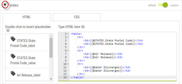 The author writes the content in HTML in the right side panel and has the possibility to insert variables from the left panel. The variables represent the list of attributes of the dataset (value label).