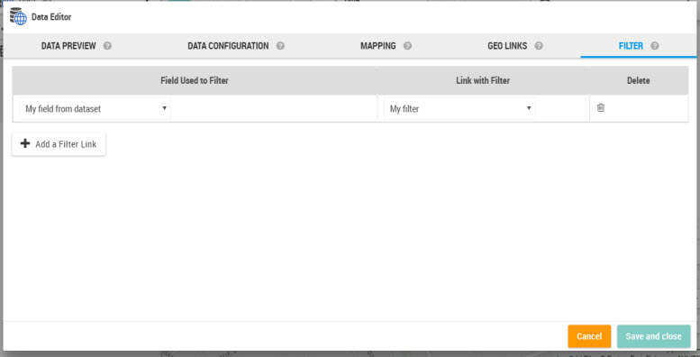 The actualization of the filters from the settings page creates automatically a link between the filters added and the corresponding dataset. This link is visible from the Filters tab from the Data panel. It is also possible to link several datasets to a same filter as described in the following section. |