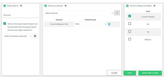 If the checkbox “Show in report panel” is selected, then the report will directly appear on the left panel and can be downloaded without doing a geographic selection.