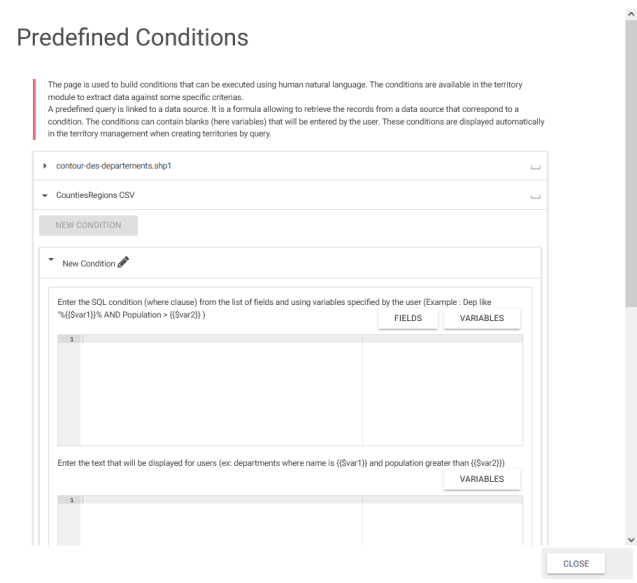 A predefined query is linked to a data source. It is a formula allowing to retrieve the records from a data source that correspond to a condition. The conditions can contain blanks (here variables) that will be entered by the user. These conditions are displayed automatically in the territory management when creating territories by query.