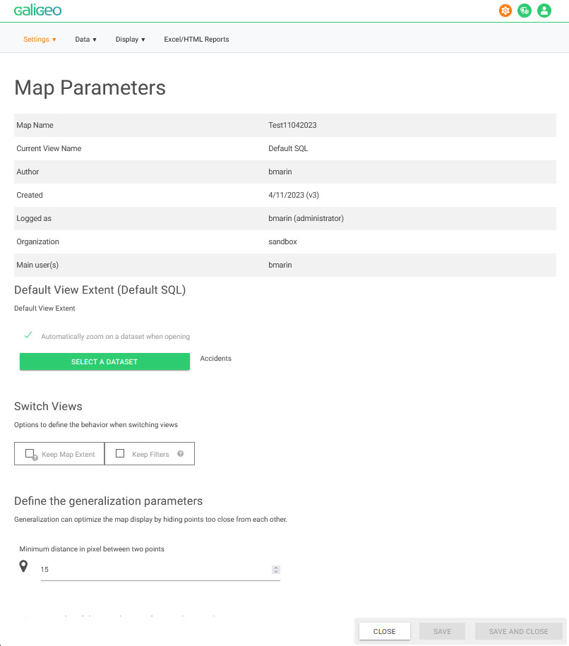 The settings page allows the managing and defining of all advanced parameters of the current map.